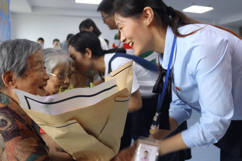 ![]() ▲年輕黨員們向老黨員們獻上鮮花,以表示對他們的感激和感謝之情。