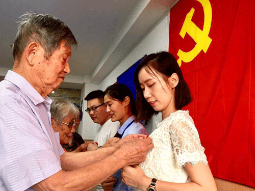 ![]() ▲老黨員們?yōu)槟贻p黨員佩戴黨徽,意味著年輕的黨員同志們接受這革命火炬,繼續(xù)繼承和發(fā)揚黨的光榮傳統(tǒng),永葆共產(chǎn)黨員的先進性,為黨的發(fā)展做出新的貢獻。