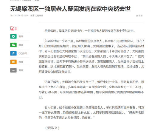 ![]() 這是一條令人非常痛心的新聞!子女工作繁忙不能經(jīng)常陪伴老人,導(dǎo)致小區(qū)里的獨居老人越來越多,這是大多數(shù)家庭都會遇到的情況。有些子女為老人選擇了合適的養(yǎng)老機構(gòu),但不少老人就和新聞里的尤阿婆一樣不愿意離開,舍不得老鄰居,怕寂寞。