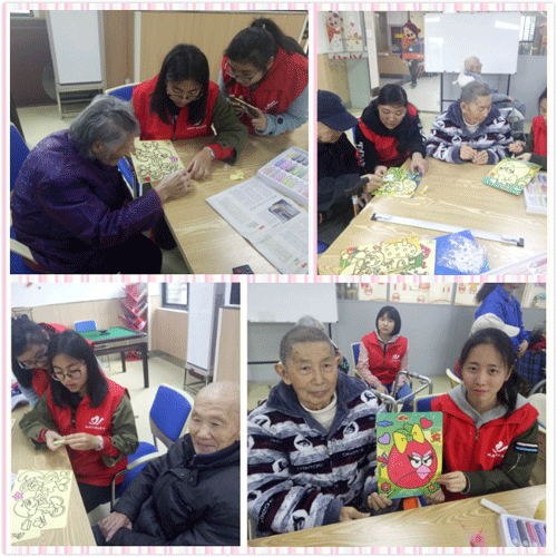 當天與沈教授一起前來的還有無錫衛(wèi)校的學生們,陪老人聊天、玩沙畫、布置環(huán)境為老人做些她們力所能及的事情。